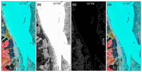 Waterline extraction based on edge detection and mathematical morphology. (a) Landsat-8 OLI standard false-color composite (R: 5, G: 4, B: 3), acquired on 23 February 2018; (b) MNDWI water index; (c) canny operator for water and land segmentation; (d) results of waterline extraction.