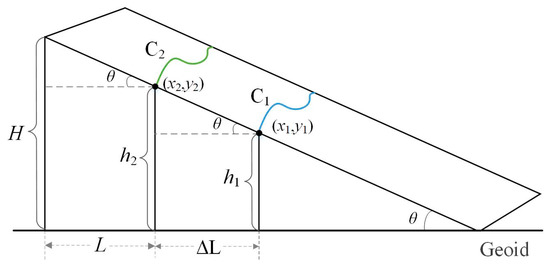 where θ is the tidal slope; (x1, y1) and (x2, y2) are the coordinates of two discrete points; H is the tidal height of the mean high tidal level, and L is the distance from the waterline to the coastline; that is, L is the distance that should be correct [32].
