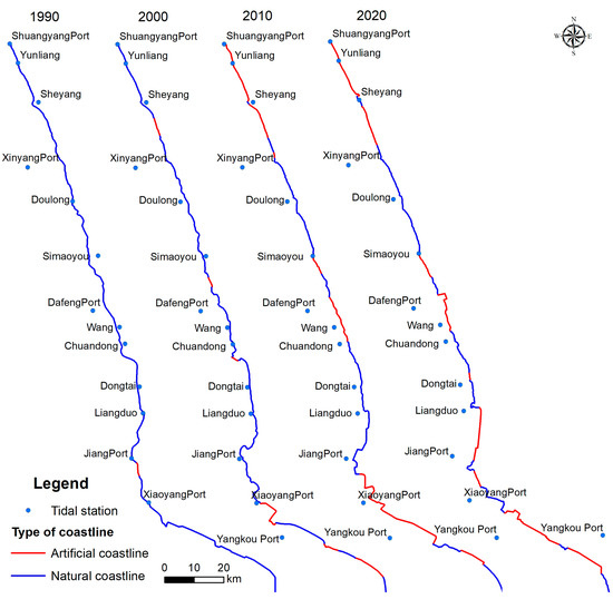 We obtained the coastline from the years 1990 to 2020 after correcting the instantaneous waterlines. Considering the imaging quality and monitoring period, the Landsat images were preferred. For the years when Landsat images were unavailable, the HJ-1 CCD images were used as complement. A total of 31 coastlines were obtained after tide correction, eight of them were extracted from the Landsat-8 OLI images, and 22 of them were extracted from the Landsat-5 TM images, and only one coastline was extracted from HJ-1 CCD (Figure S5). To clearly demonstrate the spatial changes of coastlines in different years, our study presented the coastlines at 10-year intervals from 1990 to 2020, and the results corresponding to the four periods (the years of 1990, 2000, 2010, and 2020) were shown in Figure 4. The results showed that due to the rapid development of the coastal areas in central Jiangsu, the natural coastlines declined, and the artificial coastlines increased as a result of a large amount of replacement from the natural coastline to artificial coastline. Specifically, all the coastlines slightly increased from 238.1 km to 249.1 km in the past 30 years, which is due to the increase of artificial coastline. The natural coastline greatly decreased from 233.8 to 118.5 km, while the artificial coastline rapidly increased from 4.3 to 130.7 km. In terms of temporal dimensions, the increment of artificial coastline mostly took place from 1990 to 2015, especially after 2009, when tidal flat reclamation and port construction projects sprawled rapidly. However, the length of artificial coastline remained almost unchanged after 2015 because coastal reclamation and construction were strictly controlled. In terms of spatial dimensions, the artificial coastline mainly occurred from the Biandan to the Sheyang Estuary of the northern Jiangsu coasts, as well as from the Xiaoyang to the Yangkou Port of the southern Jiangsu coasts. The natural coastline was mainly concentrated on the Sheyang to Liangduo Estuary, with a relatively straight distribution, which was scattered for other places. It is worth mentioning that some ports were constructed relatively early, while the coastline was advancing seaward; thus, the ports were not distributed along coastlines.