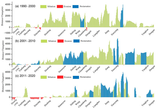 To provide detailed changes in the coastline during each period, we divided the study period into three decades every 10 years (Figure 5). The results showed that the coastlines along central Jiangsu generally moved toward the sea in the past 30 years, mainly resulting from sediment siltation and tidal flat reclamation. However, the change in coastlines varied significantly for different decades. In the 1990s, the coastlines were generally silted up, with the length of silted coasts reaching 198.5 km. The reclaimed coastline was mainly distributed from the Wang Harbor to the Chuandong Estuary and the south of the Xiaoyang Harbor, with the length of 10.5 km. In the 2000s, the coastlines were basically prograding, and the length of reclaimed coastline increased significantly compared to that in the 1990s. The reclaimed coastlines mainly occurred from the Simaoyou to the Chuandong Estuary and to the south of Xiaoyang Port, with a length of 88.5 km, ~40% of the total coastlines. In the 2010s, the most remarkable changes of the coastline occurred from the Liangduo Estuary to the south of Xiaoyang Port, and the changes were dominated by both siltation and reclamation. The lengths of silted and reclaimed coastlines were 102.5 km and 57 km, while the length of unchanged coastlines accounted for 28.5 km. During this period, the 33 km coastlines experienced ongoing erosion, mainly located to the north of Shuangyang Port and the coast from the Sheyang Estuary to Doulong Port. This was because the tidal flats along the northern Jiangsu coasts were narrow, and they were frequently affected by human activities such as tidal flat reclamation and port construction. Therefore, the northern coastlines gradually changed from natural coastline to artificial coastline, resulting in direct connection to the sea. As a result, the erosion node gradually moved from north to south (about 1.8 km), and the southern Doulong Port can be considered the transition zone from erosion to siltation during this decades.