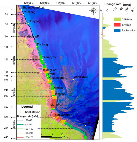 To quantitatively analyze the spatio-temporal dynamics of coastlines, we determined a baseline as the reference. The baseline is generally determined according to the direction of the whole coast and is simultaneously parallel to the coastlines from each period. Given that the direction of the central Jiangsu coast changes obviously at the Jiang Port, the baseline was set with two segments, the northern part from Sheyang Estuary to Jiang Port and the southern from Jiang Port to Xiaoyang Estuary. Specifically, we first generated a buffer landward to the coastline of 1990 with a radius of 500 m; then, we slightly adjusted the turning points of the buffer boundary to make it as straight as possible; finally, two baselines were extracted from the buffer boundary for the northern and southern parts. Afterwards, the DSAS (vers. 3.2) developed by USGS was used to generate profiles perpendicular to the baseline at 500 m intervals toward to the sea. The coastal erosion and siltation changes at the profiles were quantitatively analyzed by counting the distance, using Equations (3) and (4) [32]: