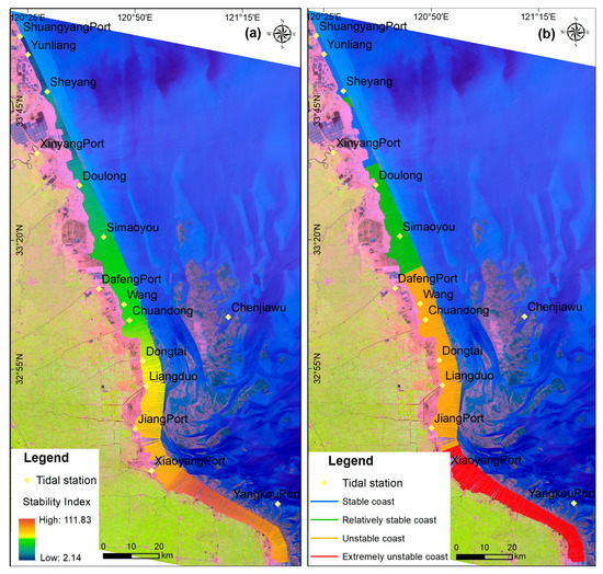 Stability division along the central Jiangsu coast: (a) Spatial distribution of the stability index; (b) spatial distribution of stability grades.