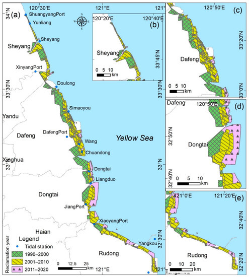 Spatio-temporal distribution of reclamation areas along the central coast of Jiangsu. (a–e) Enlargement of partial reclamation areas.