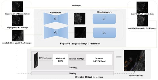 This section illustrates the proposed method of a data augmentation strategy in an object detection task based on unsupervised domain adaption in the following order: unpaired image-to-image translation, low-quality SAR image generation with annotations, and oriented object detection. At the initial stage, the background characteristic of low-quality SAR images is imitated using generators of CycleGAN via unpaired image-to-image translation. The cycle-consistency loss is adopted to achieve cycle mappings between two data distributions of two domains as follows: the high-quality SAR as the source domain and the low-quality SAR with strong interferences as the target domain. Therefore, during the second step, the translator keeps the geographic and semantic information of scenes invariant and only simulates the appearances of strong interferences when converting the high-quality SAR images to low-quality SAR images so that the inheritance of original annotations (rotated bounding boxes) from the source domain to target domain is feasible and sensible. During the last process, a state-of-the-art oriented-object-detection algorithm based on deep learning, named the Oriented R-CNN, is explored for low-quality SAR ship detection with multiple traditional data augmentation strategies and the proposed method of generating artificial low-quality SAR images as training samples, which is verified to be beneficial and meaningful for detector performance improvement.