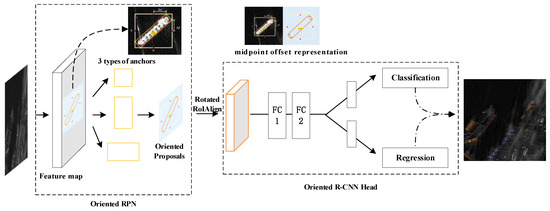 In the second stage, an oriented R-CNN head is responsible for refinement and recognition of oriented Regions of Interest (oriented RoI). Fixed-size feature vectors are derived using rotated RoI alignment and sent into two fully connected layers, followed by two parallel fully connected layers for classification and regression tasks, respectively.