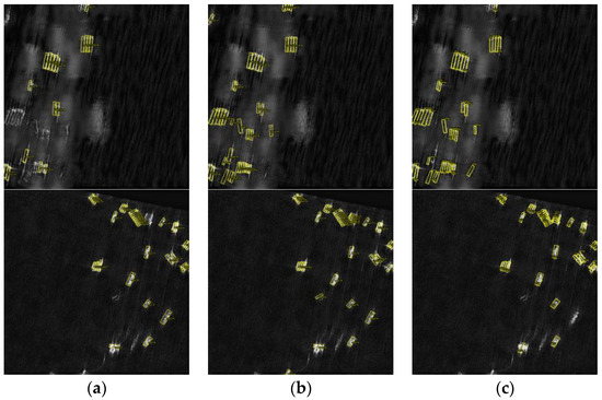 All these experiments were conducted on two NVIDIA GeForce RTX 3090 GPUs for a total of 36 epochs on the GaoFen-3 ship dataset and 120 epochs on the SRSDD-V1.0 dataset with a batch size of 4. The learning rate was 0.005, and the momentum was 0.9 with a weight decay of 0.0001 on an SGD optimizer. The Oriented R-CNN worked as the baseline for our experiments on SAR ship detection with rotated bounding boxes. In addition, random flipping and random cropping were regarded as standard data augmentation strategies. More training epochs were applied on the SRSDD-V1.0 dataset for enough iterations with fewer training samples when keeping the batch size constant.