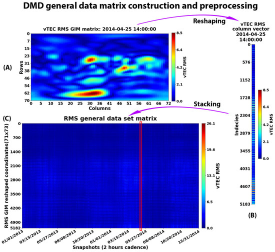 Illustration of preprocessing and constructing the DMD data set matrix: (A) (dim) vTEC RMS GIM sourced from IGS and dated 25 April 2014 at 14:00; (B) RMS map reshaped into a column vector; (C) final daily stacked column vectors data set matrix, covering system snapshots of years 2013 and 2014.
