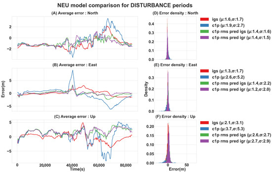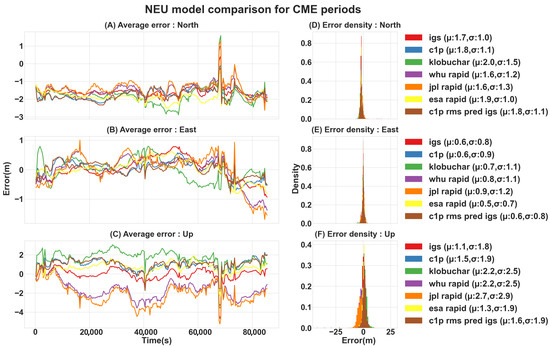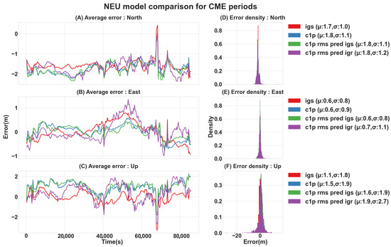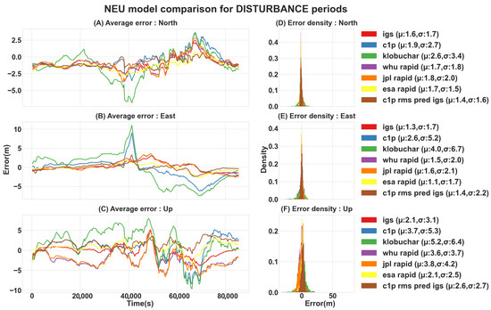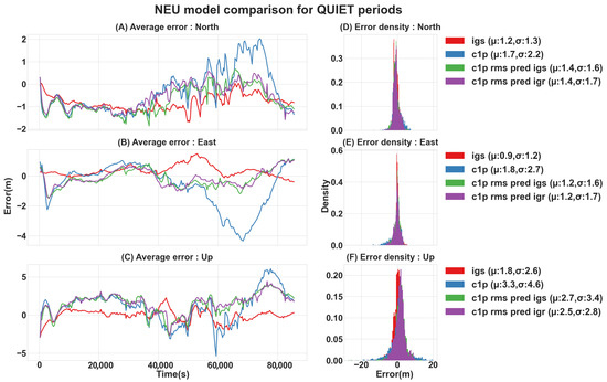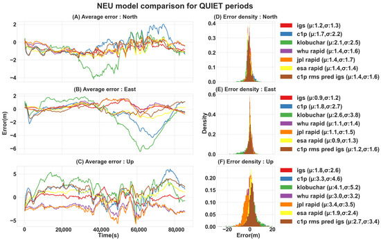 NEU error [m] comparison of quiet case studies: (A–C) show the average north, east, and up errors over 24 h, respectively; (D–F) show the total north, east, and up error distributions, respectively. (The statistics are presented for NEU absolute values).