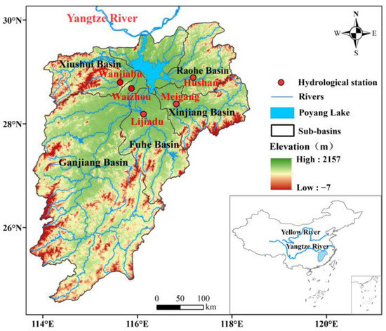 The Poyang Lake catchment (113°35′–118°29′E, 24°29′–30°05′N) covers an area of 1.62 × 105 km2 in the Yangtze River basin. It has a subtropical warm and humid monsoon climate with an annual average temperature of 17.5 °C and an annual average precipitation of 1638 mm [28]. The catchment consists of five sub-basins (i.e., Ganjiang, Fuhe, Xinjiang, Raohe, and Xiushui) and the main Poyang Lake (Figure 1). The primary land use types of the catchment are forest (64%), cropland (26%), and grassland (4%) [29]. It is surrounded by mountains on three sides, with rolling hills in the center and Poyang Lake plain in the north; the elevation of the catchment varies from −7 m to 2157 m (Figure 1). Red soil and yellow soil are the most widely distributed across the catchment, with approximately 20% of the land area in the catchment experiencing soil erosion [30]. The river system of Poyang Lake is composed of five main rivers and various smaller rivers that flow directly into the lake, with the inflows from all rivers discharging into the main stem of the Yangtze River at Hukou. Moreover, the Poyang Lake catchment is dense in rivers and lakes, with about 490 rivers over 100 km2 and 51 rivers over 1000 km2 [31]. The mean annual runoff is 152.5 billion m3, accounting for about 16.3% of the Yangtze River basin. The catchment is also an important production base of rice, cotton, and oilseed rape products in China [32]. During the past few decades, numerous water conservation projects have been implemented in the catchment. For example, more than 10,000 reservoirs have been built in this region, including 30 large reservoirs with a total capacity of about 19 billion m3 [31].