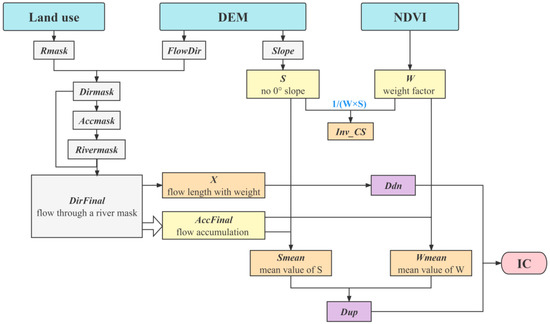 In this study, the IC proposed by Borselli et al. [13] was applied to quantify the functional connectivity of the Poyang Lake catchment, representing the potential of catchment runoff and sediment transport to the channel. In the IC calculation, the upslope component (Dup) represents the potential of upstream sediment to move downstream, and the downslope component (Ddn) describes the length of the sediment flow path to the nearest target. The vegetation factor (C) of the soil loss equation (RULSE) is closely related to the vegetation coverage f, which is applicable to the analysis of the catchment dominated by agriculture and vegetation. The primary land use type of the Poyang Lake catchment is forest, and therefore the weighting factor W for forest, grassland, and shrubs in the IC calculation are C values, and W for other land use types, using the categorical assignment method. In addition, water and cropland have a value of 0 and 0.23, respectively, with barren and impervious adopting a value of 0.35 [30]. The IC calculation was implemented in ArcGIS 10.7 using the model builder. The detailed processing methods of the model are presented in Figure 2. The C factor is calculated based on the relationship between C and f [35], where f is derived from the normalized difference vegetation index (NDVI) [36], with the calculation formula expressed as follows: