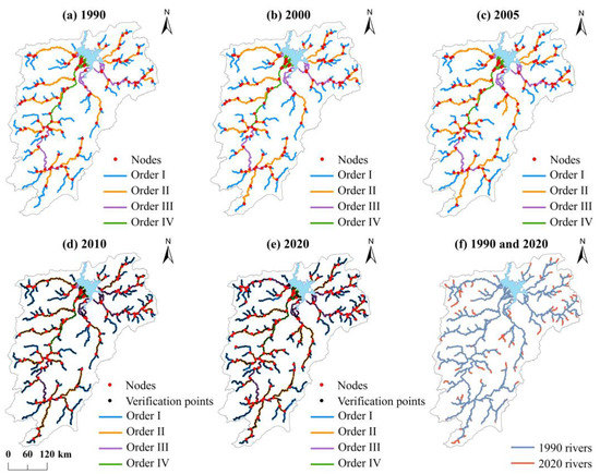 Spatial distribution of different river orders in 1990, 2000, 2005, 2010, and 2020.