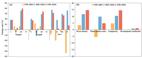The changes in river system quantity and morphometric characteristics for different periods of the Poyang Lake catchment are shown in Figure 4. The results showed that the distribution area of all order rivers indicated a decreasing trend during 1990–2005, with the largest decrease rate of around 43.2% for order IV rivers. The number and length of order II and III rivers exhibited an increasing trend, and the associated lengths increased by 11.7% and 6.6%, respectively (Figure 4a). It should be noted that order I and III rivers showed an increasing trend during the period of 2005–2020, but the number and length of order II rivers exhibited a decreasing trend. Additionally, the number and length of order IV rivers remain the same, with the area increasing by approximately 35.9% (Figure 4a). It is notable that some order II rivers are likely to transform into order I rivers or expand to become part of order III rivers. In general, except for the main stream (order IV), the number, length, and area characteristics of the river system structure of the Poyang Lake catchment showed an increasing trend from 1990 to 2020. Specifically, the most notable changes were observed in order III rivers, with growth rates exceeding 20%. Order I rivers showed an increase of over 15%, while order II river exhibited a growth rate of less than 4%.