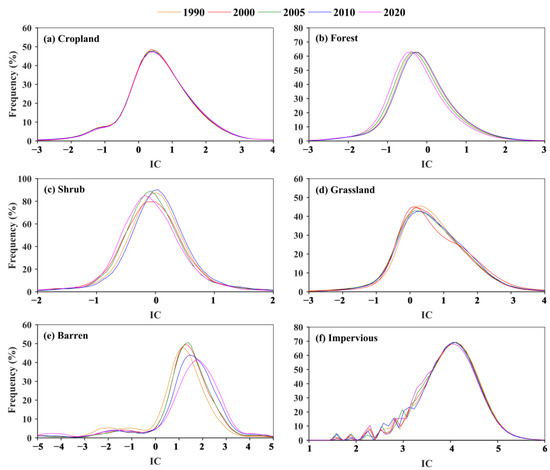 Spatial distribution of the calculated IC values during 1990–2020: the IC distribution maps for 5 periods during 1990–2020 (a–e) and the spatial changes of IC during 1990–2020 (f).