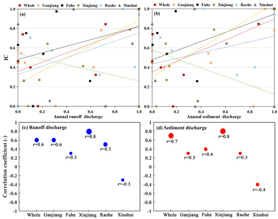 Linear fitting of the IC with runoff (a) and sediment discharge (b) at different catchment scales, and associated correlation coefficients for runoff (c) and sediment discharge (d). Larger circles in (c,d) represent a strong influence of functional connectivity on runoff and sediment.