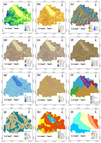 Conditioning factors of LSM. (a) Altitude; (b) slope; (c) slope aspect; (d) plan curvature; (e) profile curvature; (f) TRI; (g) TWI; (h) STI; (i) lithology; (j) distance to faults; (k) soil type; (l) annual rainfall; (m) distance to stream; (n) distance to the road; (o) land use; (p) NDVI.