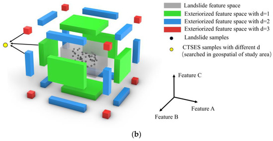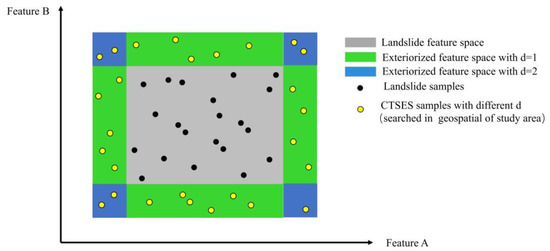TSES is proposed to create pseudo-absence data for LSM. The absence of data are produced from feature space instead of geographical space [28]. This method can make up for the defects of sampling in geospatial samples with geographical differences that may be similar in the feature space. The core principle of TSES is to extend landslide features beyond the feature space of all landslides (within the feature space of the study area) to obtain new non-landslide samples. It is reasonable for these absence samples to be created using landslide samples, as doing so preserves the regional character of the study area and enhances variability within landslide samples. Improved target space exteriorization sampling (ITSES) has been proposed to compensate for the non-existence absence samples in geographic space [29]. It maps the absence samples from feature exteriorizing space to geographic space, which gives the absence data more chances to be validated in remote sensing or field work.