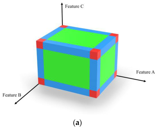 Schematic of the three-dimensional feature space of the CTSES method. (a) Three-dimensional feature space of the study area; (b) deconstruction map of the three-dimensional feature space in the CTSES method.