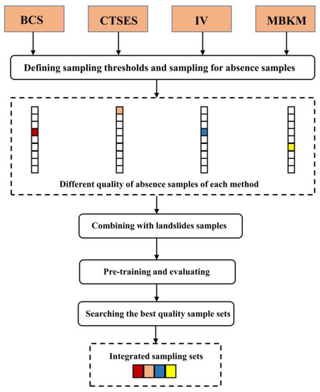Integrated sampling combines four absence sampling methods, namely BCS, CTSES, IV, and MBKM, and the process is shown in Figure 7. The main processing steps are as follows: (1) defining sampling thresholds and sampling for absence samples of each method; (2) pre-training and evaluating combining with landslide samples; and (3) forming the new integrated absence samples by assembling the best-quality sample sets for each method. The best-quality sample sets are discriminated by the comprehensive predictive performance metrics in the pre-training results.