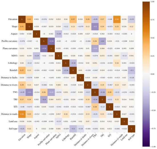 Here, correlation analysis was performed to determine the statistical correlation among more than two variables. Multiple correlation analysis of conditioning factors in landslide susceptibility mapping is important and represents the screening process for selected indicators. If variables with strong correlations are input into the model, the complexity of the model will increase, and the training process of the model will also be affected. Thus, correlation analysis and screening of conditioning factors are indispensable steps in LSM [46]. In this study, commonly used correlation indicators, including the Pearson correlation coefficient (PCC), variance inflation factor (VIF), and tolerance (TOL), were selected to scan the correlation and multicollinearity between the conditioning factors.