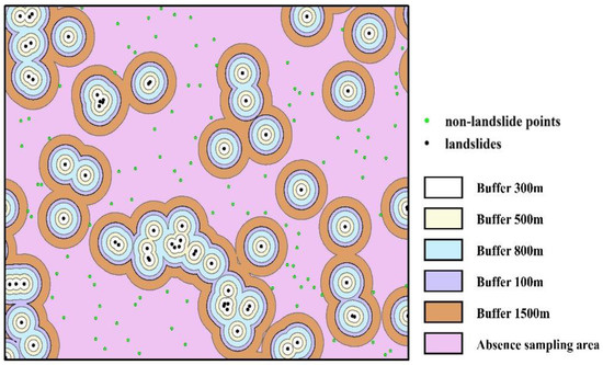 BCS is a quick, easy way to create non-landslide samples and is widely used in LSM [47]. The essential basis of BCS is similar to the first law of geography, which states that things close together in geographical space have a stronger connection. Accordingly, in the landslide inventory map, the area adjacent to a landslide is more susceptible to landslides. This is also consistent with the physical mechanics and disaster-forming environment of a landslide. Rock and soil in areas close enough to the landslide are more susceptible to further sliding due to the scraping or accumulation of previous landslides. Moreover, due to the continuity of engineering geological conditions, areas relatively close to landslides are more likely to develop the same geological environment and be exposed to strong external triggers. Therefore, the BCS method could set a buffer zone at a certain distance around the landslide location in the landslide inventory map and complete the sampling work in areas outside the buffer zone within the study area to reduce the strong effect of the spatial proximity of landslide events.
