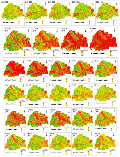 The prediction model evaluation metrics for the integrative sampling approach are shown in Table 4. The training set accuracies were all greater than 0.9, while the training set accuracy of RF was maintained at a high level (>0.95). The testing accuracy and comprehensive predictive performance metrics, including the AUC, KC, and POA of SVM, were less than those of RF. When the ratio was 1:1, the various metrics fell within the region of the BCS and the other three models. The combined predictive performance of the integrative sampling model was stronger than that of BCS but weaker than the performances of CTSES, IV, and MBKM under the same set of absence sample intervals. When the ratio changed from 1:1 to 3:7, each parameter decreased slightly, resulting in a slight decrease in prediction performance. In terms of susceptibility distribution, the mean value of integrative sampling was slightly higher than that of BCS but significantly lower than those of CTSES, IV, and MBKM. When the ratio changed from 1:1 to 3:7, further significant decreases in the mean value occurred (from 0.52 and 0.56 to 0.36 and 0.39).