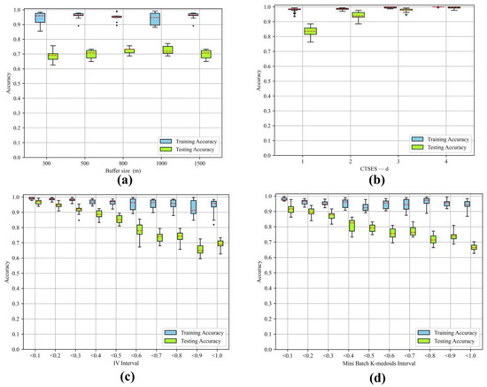 Accuracy results of SVM-based absence sampling. (a) BCS; (b) CTSES; (c) IV; (d) MBKM. The “+” represents a small number of abnormal values that are outside the normal range.