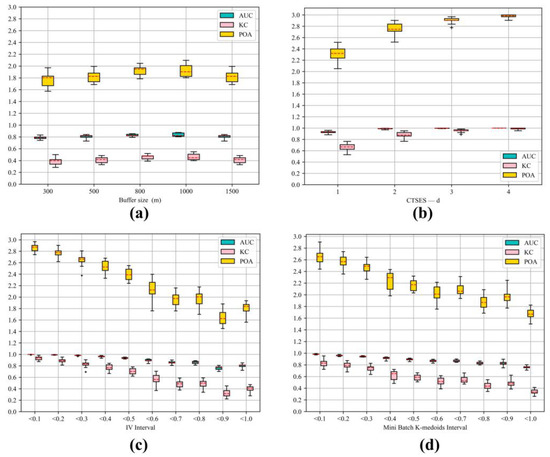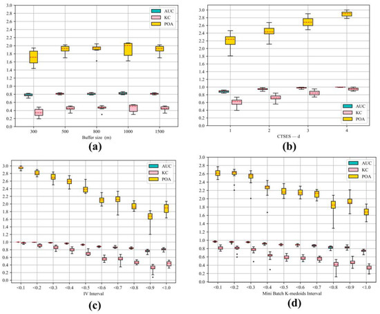 Three metrics, namely AUC, KC, and POA, were used to weigh the comprehensive predictive performance of each model consisting of each group of samples. They are presented as box plots in Figure 17 and Figure 18. The three metrics have a consistent pattern. In BCS, they increased slightly when the buffer size changed from 300 to 1000 m and decreased slightly to 1500 m. In BCS, the AUC was around 0.8, the KC did not exceed 0.6, and the POA reached a maximum of approximately 2.0. In CTSES, the three metrics gradually increased as d varied from 1 to 4. In IV and MBKM, the three metrics gradually decreased as the sampling threshold increased. In addition, the AUC approached 1 and even the POA approached 3 at low sampling intervals in IV and MBKM or a higher d in CTSES. In both the RF and SVM prediction models, the above-mentioned pattern was present.