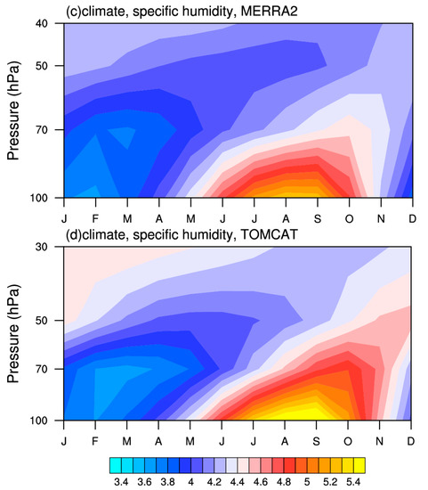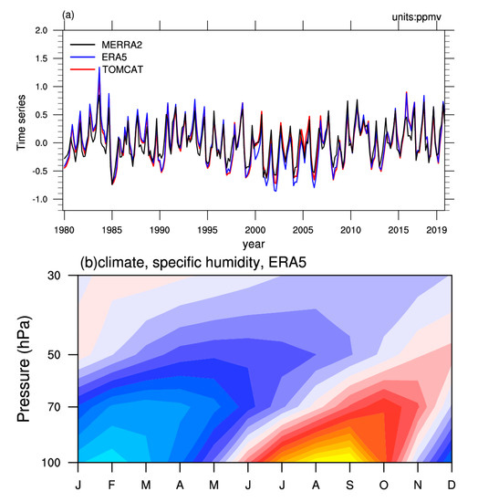 First, the water vapor data in ERA5 and MERRA-2 are mainly based on conventional observations (such as radiosondes or satellite retrievals), whereas the stratospheric water vapor simulated in TOMCAT is mainly produced by the chemical reactions (e.g., methane oxidation). Differences may exist between observed and simulated values. In order to make a more intuitive comparison of the water vapor data and to quantify the tropical-averaged stratospheric water vapor concentration, Figure 1a shows the monthly time series of stratospheric water vapor anomalies averaged in the tropics (30°N–30°S) at 100 hPa from 1980 to 2020 for the two analysis dataset ERA5 and MERRA-2, along with simulations by TOMCAT. In addition, the seasonal variation of stratospheric water vapor climatology in the tropics from 1980–2020 for the three datasets are presented in Figure 1b–d, respectively. Apparently, the water vapor for climatology and anomalies in the three datasets agree well with each other, with the best agreement between ERA5 and TOMCAT. From the climatology of water vapor, there is a significant seasonal variation in the concentration of stratospheric water vapor, with a minimum of 3.5 ppmv in winter and up to 5.4 ppmv in summer, which is consistent with previous studies [75,76,77]. In terms of water vapor anomalies, the anomalous values of 100 hPa water vapor generally ranged from −0.75 to 0.75 ppmv during 1980–2020, implying an amplitude of 10–20% of stratospheric water vapor variability [78,79]. It is worth noting that a large water vapor anomaly occurred in 1983, which may have been triggered by the volcanic eruptions of El Chichón in Mexico in 1982. Following the volcanic eruption, a massive volume of volcanic aerosols heated the stratosphere, leading to a significant increase in the water vapor content of the stratosphere [80]. Apart from the seasonal cycle, the time series also exhibits strong interannual variability, in line with previous studies [42]. The majority of the interannual variability is due to interannual changes in the tropical sea surface temperature, especially ENSO.
