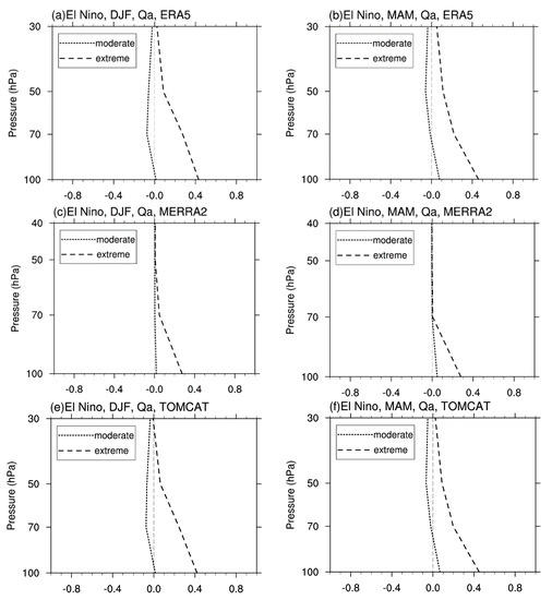 Vertical profiles of tropical−averaged water vapor anomalies (Qa; units: ppmv) during extreme El Niño (dashed lines) and moderate El Niño (dotted lines) events in (a,c,e) winter and (b,d,f) spring based on the (a,b) ERA5 and (c,d) MERRA-2 and (e,f) TOMCAT.