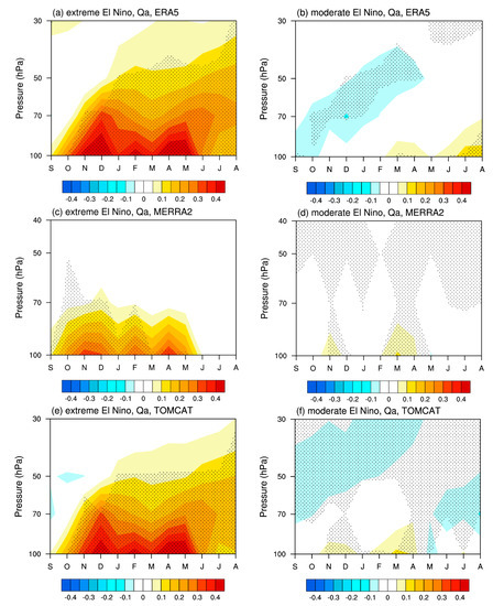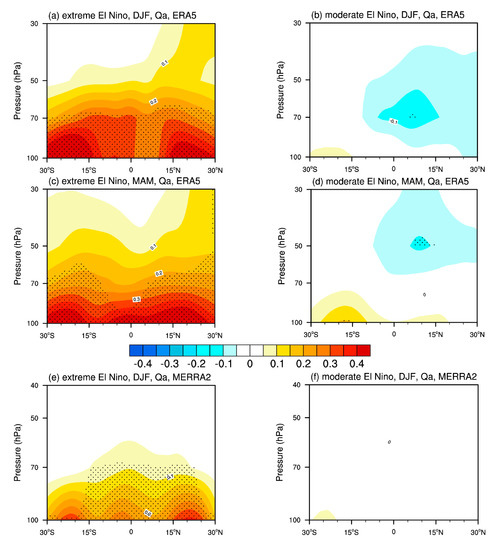 The zonal distribution of water vapor anomalies (Qa; units: ppmv) for (left column) extreme El Niño and (right column) moderate El Niño events in (first and third rows) winter (DJF) and (second and fourth rows) spring (MAM) based on the (top two rows) ERA5, (middle two rows) MERRA-2 and (bottom two rows) TOMCAT. Anomalies that passed the 95% significance test are stippled.