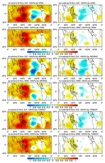 The horizontal distribution of tropical water vapor anomalies (Qa; units: ppmv) at 100 hPa during (left column) extreme El Niño and (right column) moderate El Niño events in (a,b,e,f,i,j) winter (DJF) and (c,d,g,h,k,l) spring (MAM) based on the (top two rows) ERA5, (middle two rows) MERRA-2 and (bottom two rows) TOMCAT. Anomalies that passed the 95% significance test are stippled.