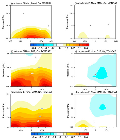 Since the majority of El Niño occurrences mature in winter (December, January and February) and gradually decay the following spring (March, April and May), we will focus on the changes in the lower stratospheric water vapor in El Niño winter and the following spring. Based on ERA5, MERRA-2 and TOMCAT simulations, Figure 2 shows the vertical profiles of tropical-averaged stratospheric water vapor anomalies during extreme and moderate El Niño winters and the following springs. The water vapor anomalies in the lower stratosphere are substantially stronger during extreme El Niño events than during moderate events in all three datasets. The tropical lower stratosphere experiences significant wetting during extreme El Niño episodes, with the stratospheric water vapor increase exceeding 0.4 ppmv in both the El Niño winter and the following spring. In contrast, in the case of moderate El Niño, the lower stratospheric water vapor shows a rather weak, if any, decrease in the winters and a weak increase at 100 hPa (~0.1 ppmv) in the following springs. (Figure 2a,e). Interestingly, the water vapor wetting value of the extreme El Niño in spring is four times that of the moderate El Niño, which corresponds to the four times higher response of the Northern Hemisphere stratospheric vortex to extreme El Niño than moderate event derived by Zhou et al. [59]. The results for MERRA-2 are similar to those of ERA5 and TOMCAT, but the stratospheric water vapor increase in MERRA-2 is close to 0.3 ppmv during extreme events. In addition, we also note that the water vapor increase does not significantly vary from winter to spring during extreme events, while it slightly increases during moderate El Niño events.