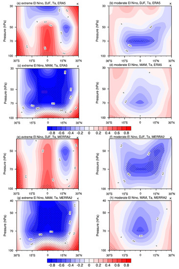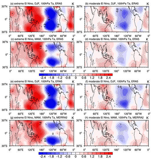 The horizontal distribution of tropical temperature anomalies (Ta; units: K) at 100 hPa during (a,c) extreme and (b,d) moderate El Niño events in (a,b) winter (DJF) and (c,d) spring (MAM) based on the (a–d) ERA5 and (e–h) MERRA-2. Anomalies that passed the 95% significance test are stippled.
