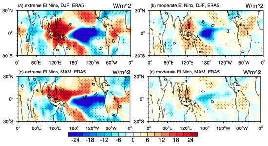 The temperature anomalies are interpreted using the tropical convection excited by the ENSO because thermally-induced deep convection occurring in the troposphere releases latent heat and excites equatorial planetary waves, which play a significant role in affecting the temperature of the upper troposphere and lower stratosphere [21]. Outgoing longwave radiation (OLR) serves as an indicator for convection in the tropics, reflecting not only the intensity of convection but also the dynamic interplay between the atmosphere over the sea and the sea surface temperature [82]. Figure 8 shows the anomalies in the outgoing longwave radiation to demonstrate the difference in convective activity in distinct strengths of El Niño events. During extreme El Niño, intense convective activity is observed centered over the Central-Eastern Pacific, which releases large amounts of latent heat, leading to significant warming in the lower stratosphere. By contrast, although similar patterns are seen during moderate events, the strengths and extent of the convection is significantly reduced. Hence, weaker amplitude convective activity in moderate El Niño events formed a colder lower stratosphere. In terms of seasonal changes, strong tropical convection persists from winter to spring in extreme El Niño activities (Figure 8a,c), while moderate events matured in winter but decayed by the following spring, thus weaker convection activity appeared in moderate El Niño springs (Figure 8d). The contrasting reactions of robust and feeble convective activity during extreme and moderate El Niño are responsible for the striking divergence in tropical tropopause temperatures. This difference in temperature further elucidates the varying effect of extreme and moderate El Niño on water vapor in the lower stratosphere of the tropics.