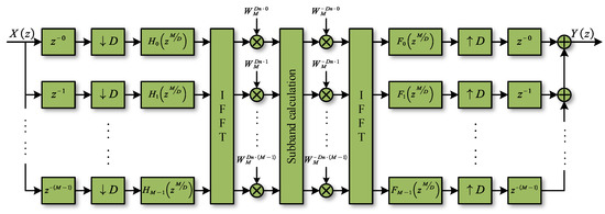 Combining Equations (9) and (12), the structure of a polyphase DFT filter bank with M channels and D times decimation can be obtained, as shown in Figure 2. It is observed that the IFFT operation is utilized at the analysis end and the synthesis end, as the rotation factor indices in Formulas (8) and (12) are both negative, similar to the form of IDFT. The IFFT operation is used solely as a tool to enhance the efficiency of the parallel operation. The structure provides a better scheme for signal parallel speed reduction processing, and the decimation multiple can be adjusted according to the actual situation, as long as the condition that D is divisible by M is met.