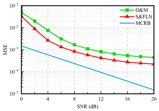 Experiment 1: Comparison of mean square error (MSE) and signal-to-noise ratio (SNR) curve between the parallel estimation algorithm and classical algorithm. Figure 7 shows that the MSE of the proposed parallel estimation algorithm is compared with that of the commonly used second-order algorithm when the SNR is 0–20 dB. The green curve in the figure is the MSE-SNR curve calculated by the O&M algorithm, and the estimation performance of this algorithm is not weaker than that of most improved algorithms at [25]. The red curve is the parallel estimation algorithm. The blue curve is a modified Cramero bound, and its expression is