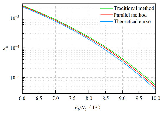 Next, the performance of the demodulation error rate is simulated and compared. Figure 10 shows the demodulation error rate curve of the parallel timing method and the traditional method when the signal-to-noise ratio is 6–10 dB. The blue curve in the figure is a theoretical curve. The theoretical bit error rate, , of QPSK modulation is