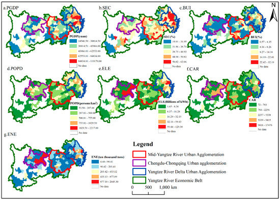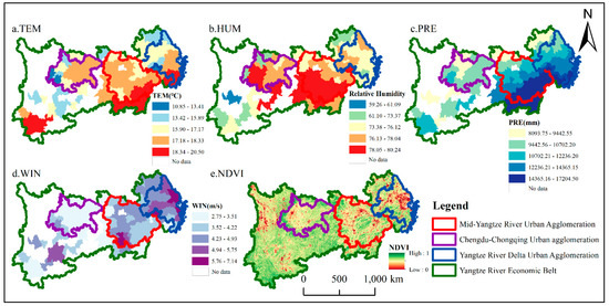 - In terms of urban agglomerations, changes in PM2.5 concentrations in the three major urban agglomerations, namely the CCUA, the YRMUA and the YRDUA, are influenced by NDVI, the proportion of secondary industries, and the proportion of urban built-up areas. Additionally, in the CCUA, population density also plays a significant role in driving changes in PM2.5 concentrations. Furthermore, the annual average relative humidity is a leading factor for changes in PM2.5 concentrations in both the YRMUA and the YRDUA, but its impact direction differs between the two regions.