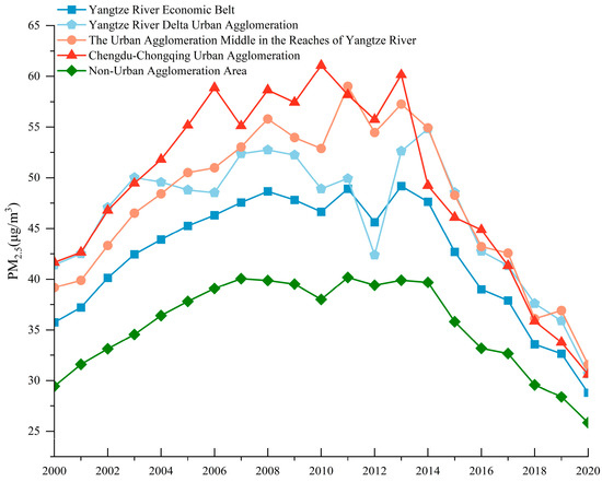 - From 2000 to 2020, PM2.5 concentrations in the YREB exhibited an “M”-shaped trend.