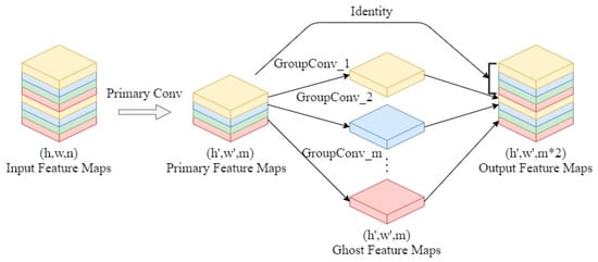 GhostNet introduced Ghost convolution as a cost-effective linear operation to generate feature maps, effectively reducing model parameters and computational workload. Figure 2 illustrates the concept of Ghost convolution, which involves dividing the traditional convolution operation into the primary convolution and the cheap convolution. The primary convolution is essentially the same as conventional convolution, but it strictly limits the total number of convolution kernels to be much smaller than that of conventional convolution. In contrast, cheap convolution utilizes the original feature map obtained by primary convolution to perform group convolution, generating redundant feature maps known as Ghost feature maps. Group convolution involves less computation and operates faster than conventional convolution, significantly reducing the model’s complexity. The primary and Ghost feature maps are combined to obtain output feature maps sufficient for feature extraction. In this approach, the primary and Ghost feature maps are kept the same size. In order to prevent an excessive number of parameters from being generated in our object detector, we employed Ghost convolution multiple times throughout the network.