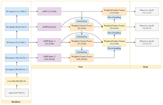 Our experimental results indicate that a single BiFPN-tiny has insufficient feature extraction capability, resulting in lower model accuracy. To address this limitation, we experimented with incorporating additional modules, such as ASPP and RFB [43], to enhance the feature extraction ability of the network. Among these, we found that the ASPP module, which combines the advantages of atrous convolution with different sampling rates, was more effective at achieving multi-scale feature fusion and extraction. We also attempted to improve the network’s feature extraction capabilities by incorporating attention mechanisms, such as CBAM [44], to highlight the essential parts of the data. However, our experimental results showed that the feature extraction capability of the network was already close to saturation, and adding the CBAM module just complicated the network structure without improving its performance.