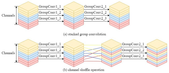 When stacking multiple group convolutions, a problem arises where the output of a particular part of the channel is derived from only a part of the input channel. To address this issue, we incorporated the channel shuffle operation into the Shuffle-Ghost bottleneck, fully utilizing each channel’s features. Figure 7a shows the situation when the group convolution is stacked. Here, the group convolution with the number of groups is three; as an example, GroupConvN_M, where N indicates the number of group convolution, M indicates which group in the group convolution. For instance, GroupConv1_1 indicates the convolution operation of the first group in the first group convolution. The convolution result of the first output group is exclusively linked to the first input group, and likewise for the other groups, leading to a hindrance in information exchange across different groups. To enhance the flow between channel groups, the channel shuffle operation divides each set of channels into multiple subgroups. Subsequently, it assigns different subgroups to each group in the next level. As depicted in Figure 7b, the first group is partitioned into three subgroups and then allocated to the three groups in the subsequent layer, following the same procedure for the other groups. With this method, the output result of group convolution will then come from the input data of different groups, enabling information flow between different groups.