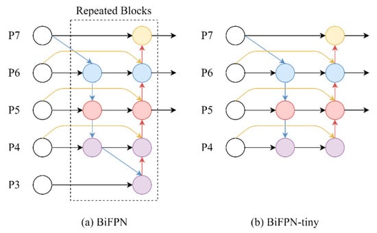 Functioning as a component linking the backbone and head, the neck plays a pivotal role in processing and merging the features extracted by the backbone to better suit the object detection tasks. In this paper, we propose a lightweight feature pyramid named BiFPN-tiny and integrate it with the ASPP module to serve as the network’s neck section. Figure 8 shows the original BiFPN and the proposed BiFPN-tiny. While the original BiFPN employs five feature extraction layers for efficient feature extraction, the design could be somewhat redundant and overlooks the characteristics of UAV images. In our initial BiFPN-tiny design, we aimed to create a lightweight model by reducing the number of feature extraction layers to 3. However, this decision had a downside, as removing the shallow feature extraction layer made it challenging for the model to extract small object features effectively. To enable effective feature extraction at various scales, we have introduced a shallow feature layer solely dedicated to fusing features of small objects. The layer is not involved in the final inference work but is an intermediate step to ensure optimal feature extraction. Furthermore, unlike the original BiFPN, which repeats the BiFPN module several times based on different resource constraints, our model only uses the BiFPN-tiny module once to meet the lightweight and inference time requirements. However, this has resulted in insufficient feature extraction ability, leading to a decline in accuracy.