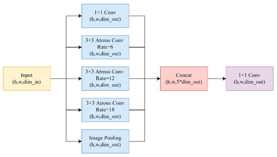 To enhance the feature extraction capability of the model, we have replaced the 1 × 1 convolution adjustment module before BiFPN-tiny with the ASPP module, as depicted in Figure 9. The ASPP module leverages atrous convolution with different sampling rates for input to obtain multi-scale features, thereby improving the model’s ability to extract features. Furthermore, to account for the varying heights and widths of input features at each layer of BiFPN-tiny, we have implemented a larger sampling rate (12, 24, 36) for shallow features with larger heights and widths and a smaller sampling rate (6, 12, 18) for deep features with smaller heights and widths. Using different receptive fields to extract different feature information for different scale feature layers, we can adjust the number of channels while fusing features to improve the model’s accuracy. Compared to the original BiFPN, the feature pyramid obtained from the fusion of the proposed BiFPN-tiny and ASPP module exhibits a more robust feature extraction ability and faster reasoning speed.