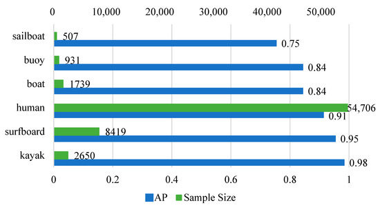 Then, we conducted a thorough analysis of the experimental results of our proposed method, as presented in Figure 11, which displays the number and detection accuracy of various targets. Notably, the three targets with the lowest detection accuracy are also the least represented in the dataset. Furthermore, due to their high frequency, humans are prone to occlude and overlap other targets in real-world images, which can result in missed detections and misjudgments. Nonetheless, our proposed method achieves a detection accuracy of up to 91% for humans, the primary object of maritime SAR, which satisfies the requirements of practical applications. Our proposed method achieves a better trade-off between performance index parameters, which is more advantageous for real-world marine SAR applications.