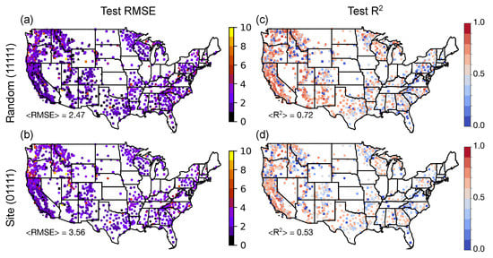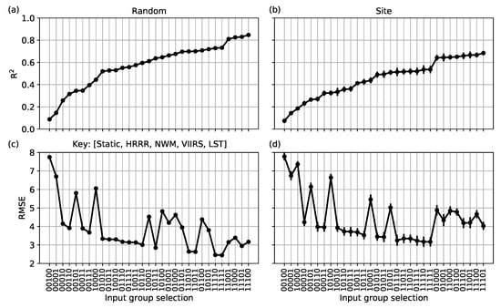 In terms of lower RMSEs, the HRRR and VIIRS variables play the most important roles as predictor groups, and the (11111) models had the lowest ensemble average RMSE for both splits, with (01111) coming in a close second. Thus, the static predictors do not play a significant role in either random or site split routine. This is potentially useful for using the model outside of the CONUS (e.g., in Alaska) because the static variables are site-dependent and can be ignored as model inputs. However, this remains to be tested until Alaska data become available. Finally, the worst model in both split cases is that utilizing the NWM only.