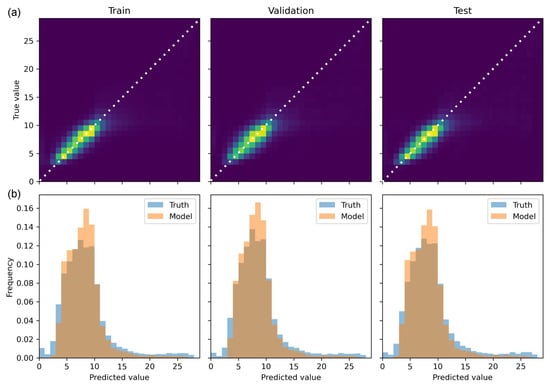 Figure 4a illustrate the comparable performance of the XGB model across the three splits. The metrics reported in the table exhibit similar values for the training and validation splits, although they are not shown. Specifically, the 2D histograms reveal a clear linear relationship between the true 10 h DFMC value and the predicted value for all three training splits. In
