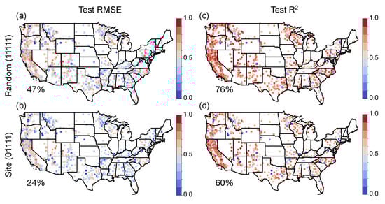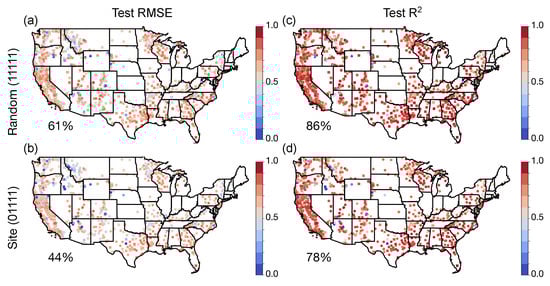 Figure 5 shows the performance metrics computed at the site level over CONUS for the XGB model trained on the 375 m site data split. Clearly, the model produces the best results in drier areas (for example, the desert in southwest and southern California, which has the lowest RMSE and highest