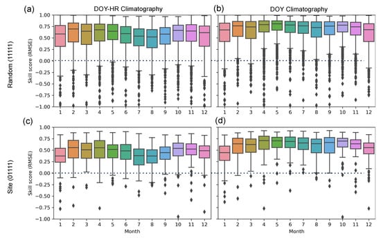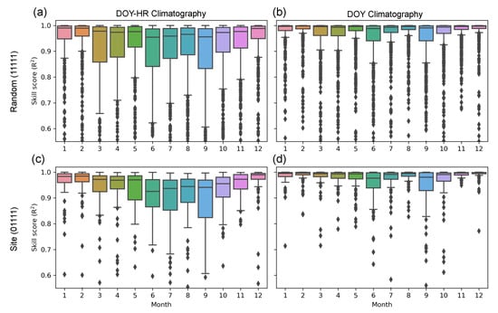 skill scores for the random and site test splits by month, respectively, starting with January (1) and ending with December (12). The data points were computed by averaging over hour-of-the-day, day-of-the-year (DOY–HR) and day-of-the-year (DOY) and then grouped by month to create the box–whisker diagrams in the figures.