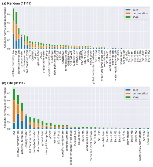 Figure 10a,b show the three computed quantities for each predictor used in random and site test splits, respectively. The figure shows the three importance metrics sorted from greatest to least importance after being summed.